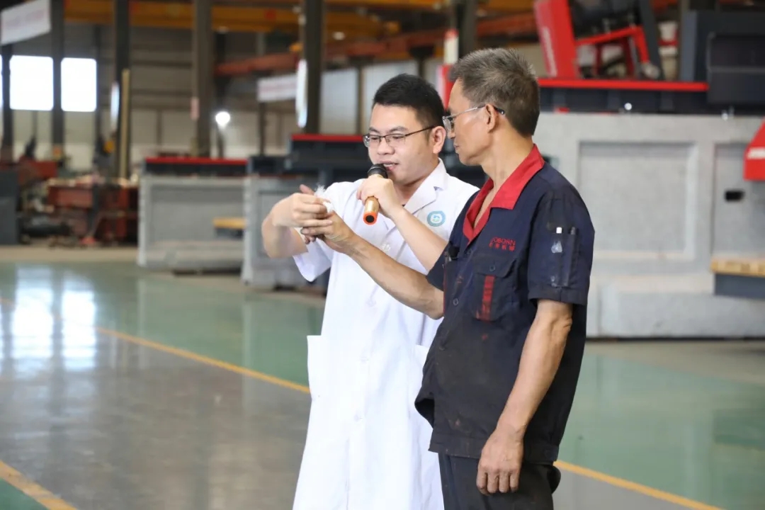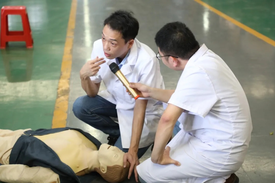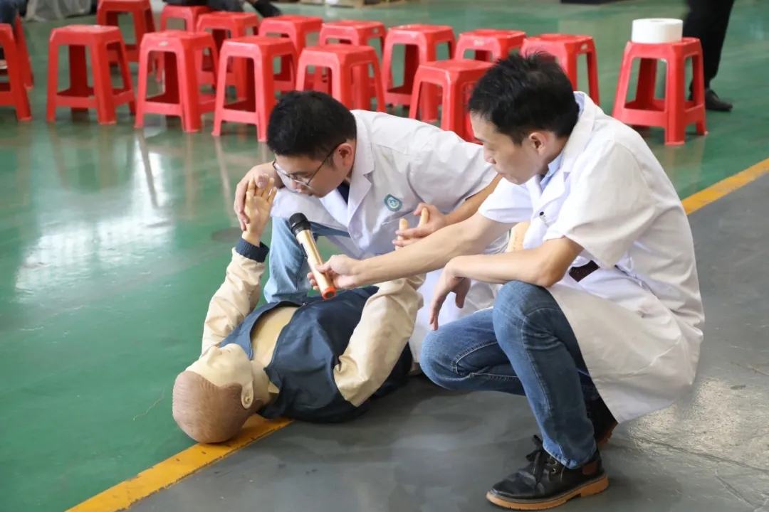 緊接著,巨邦全體員工移步車間機(jī)臺(tái)展示區(qū),由泉州濱海醫(yī)院提供醫(yī)療講座。外科專家為員工們講解一一和演示了外傷包扎、心肺復(fù)蘇、工傷院前急救,模擬火災(zāi)救護(hù)人員場(chǎng)景,員工安全防范能力有了進(jìn)一步提高。